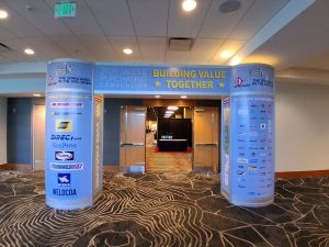 Every other year, we host the Sales and Purchasing Convention in Indianapolis. Since this was my first time designing for the Indianapolis location, I wanted to highlight the city itself through the visual theme. I leaned into a bold, 1980s-inspired color palette featuring neon yellow, magenta, green, and purple, set against a primarily powder blue background. Architectural elements were incorporated to visually reinforce that year’s tagline, “Building Value Together.” To fully immerse attendees in the concept, I also designed the event maps to resemble blueprints, tying the theme together from concept to execution.
