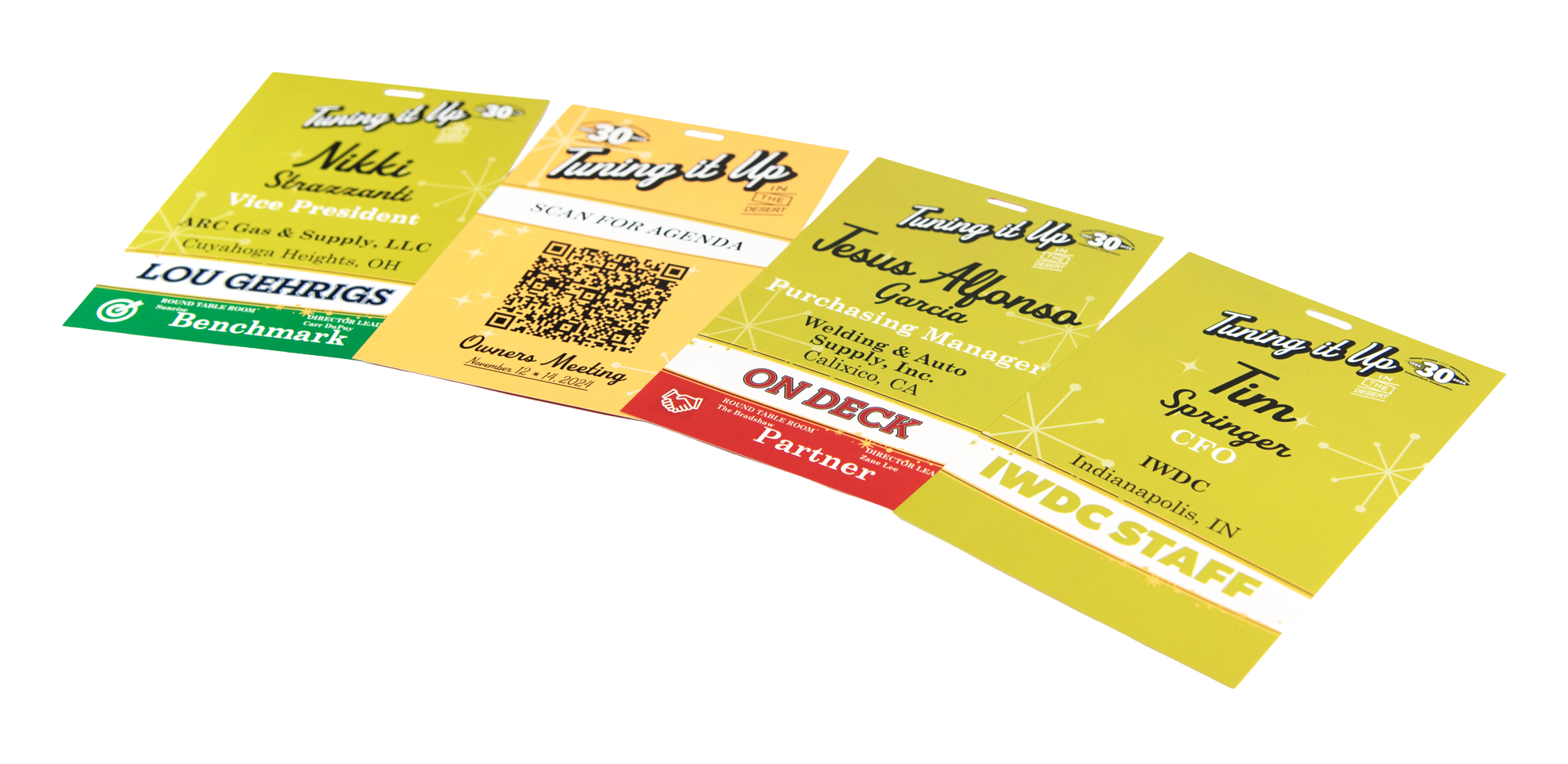 Theme designed nametags for all attendees. Built in InDesign using Date Merge. Below are the nametag variations depending on if you are an owner, staff, speaker, or new to the meeting and the back of the nametag with the Agenda QR code.